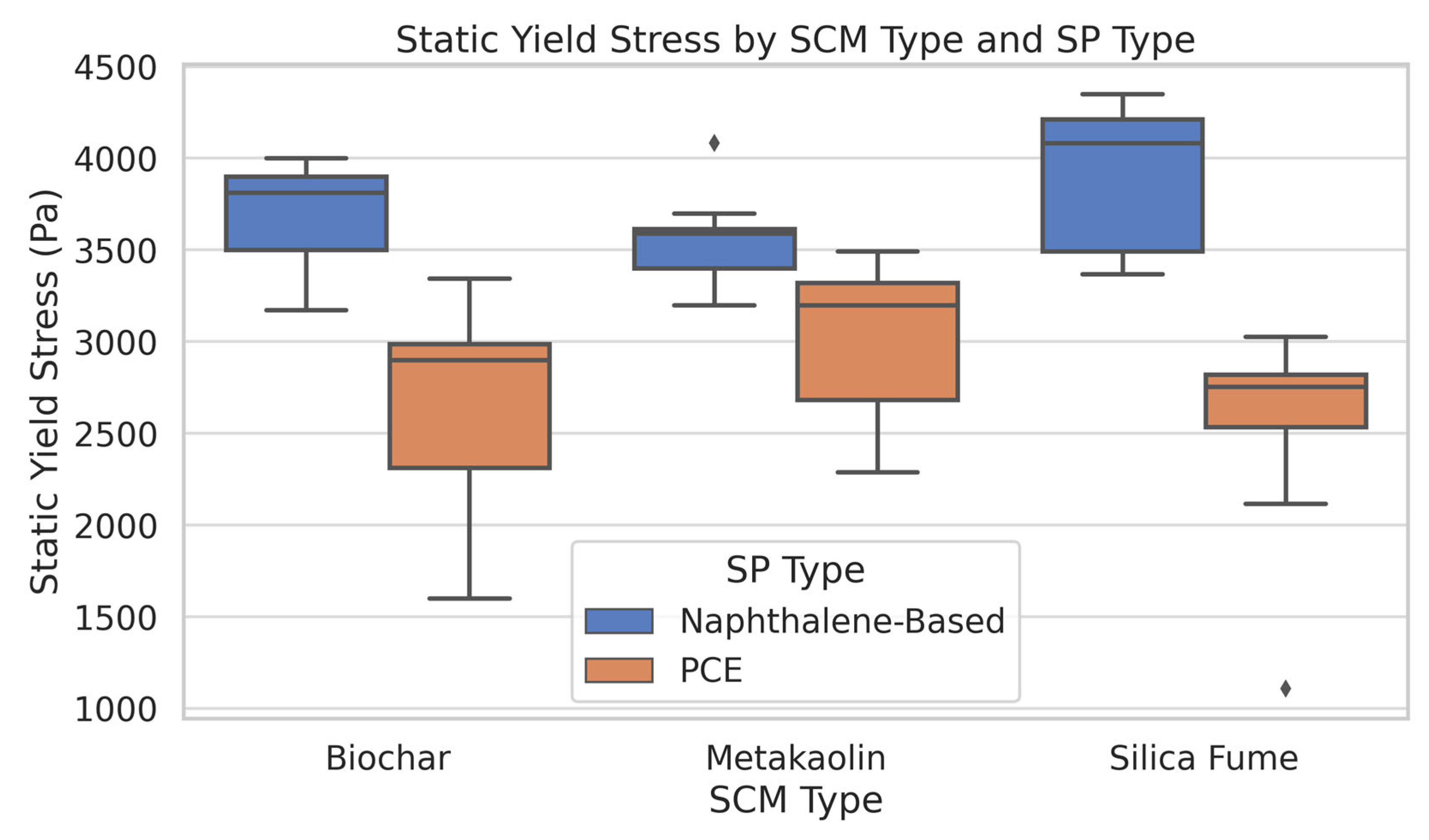 The statistical analysis revealed that superplasticizer (SP) chemistry exerted the strongest influence on static yield stress. Two-way ANOVA confirmed a highly significant main effect of SP type (