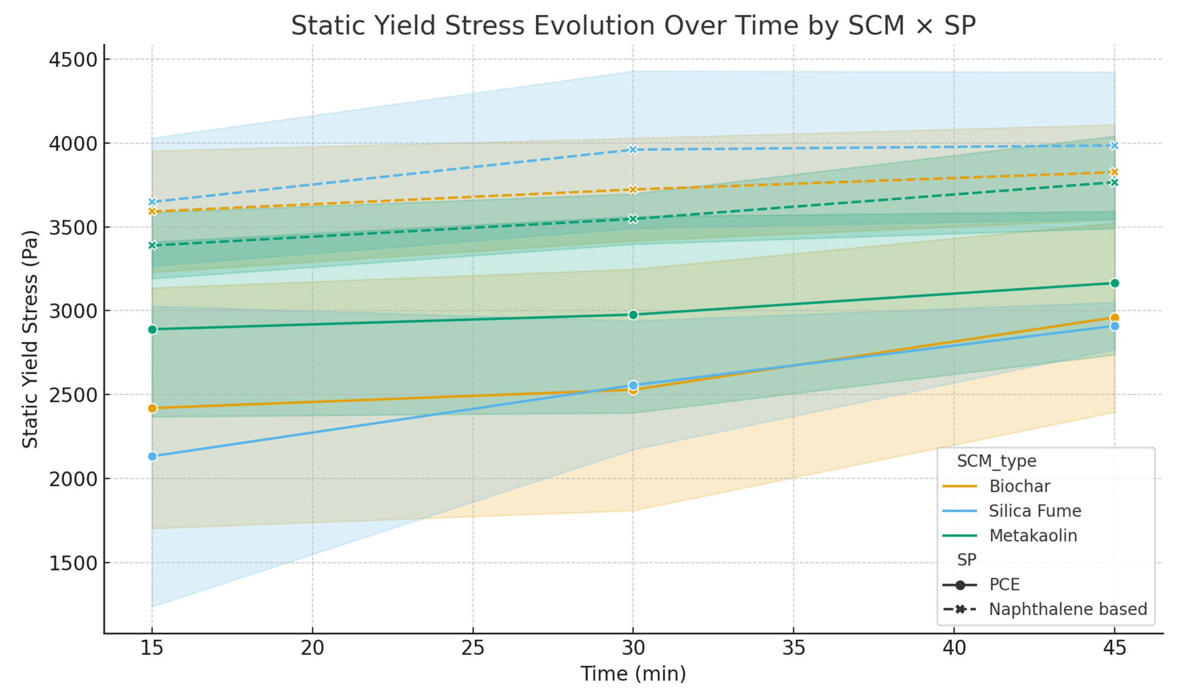 25]. Across 15–45 min, all mixes show monotonic structuration with clear SCM × superplasticizer (SP) dependencies (