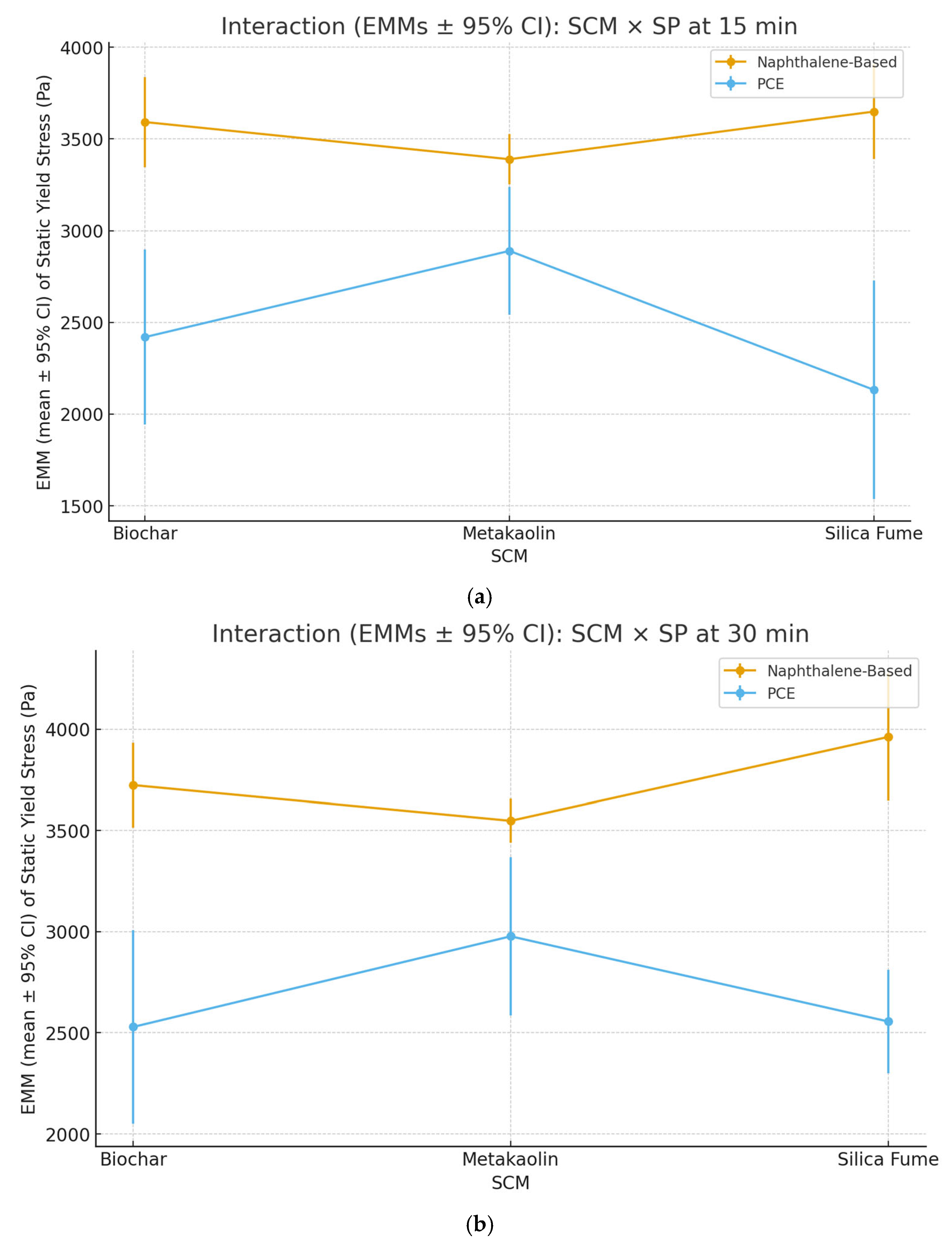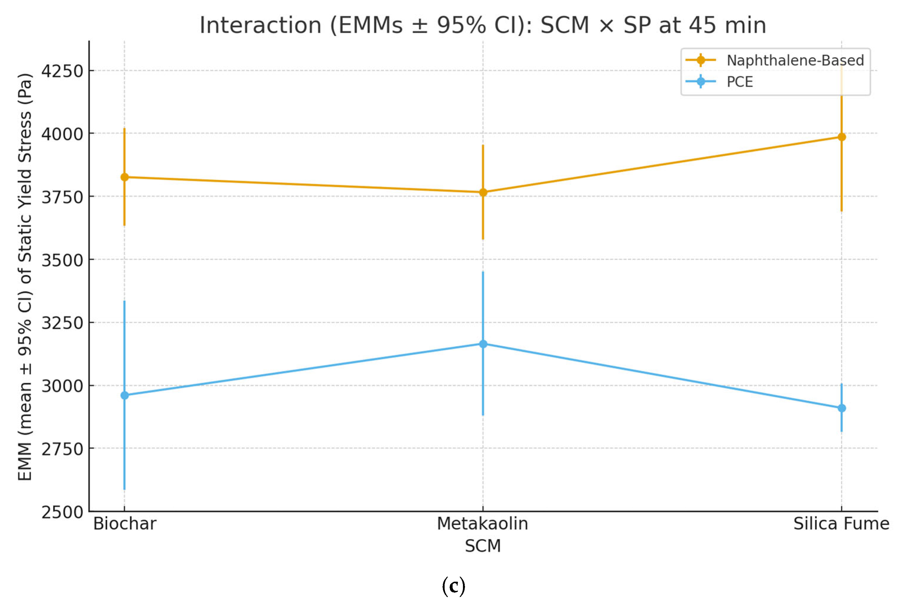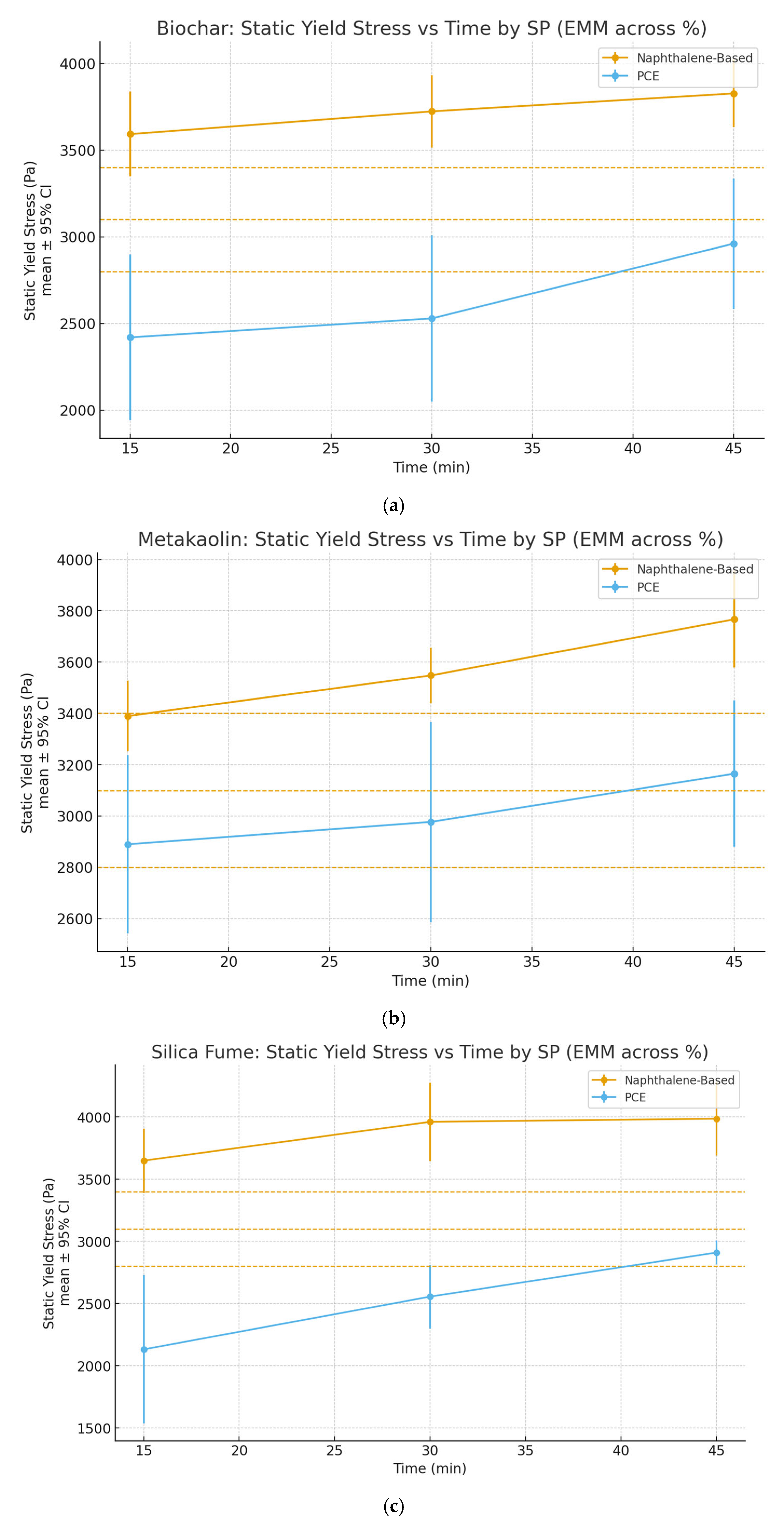 Figure 12 show that CIs are narrow (≈1–4% of the mean) and SDs remain small (CV ≈ 1–2% for PCE; ≈1.5–3% for naphthalene), indicating robust measurement precision. In the mean ± 95% CI line plots (per SCM, lines for SP), the separation between PCE and naphthalene trajectories typically exceeds the CI half-widths, visually reinforcing the strong SP main effect; when the PCE–naphthalene gap varies by SCM, the non-parallelism of the lines makes the SCM × SP interaction apparent. Horizontal reference lines at 2.8 kPa (15 min extrudability/pumpability ceiling), 3.1 kPa (30 min open time/printability ceiling), and 3.4 kPa (45 min buildability floor) allow for the direct assessment of practical performance windows. The SD vs. time plots remain low and largely flat, confirming good repeatability rather than noise-driven trends. Finally, the EMM interaction plots in