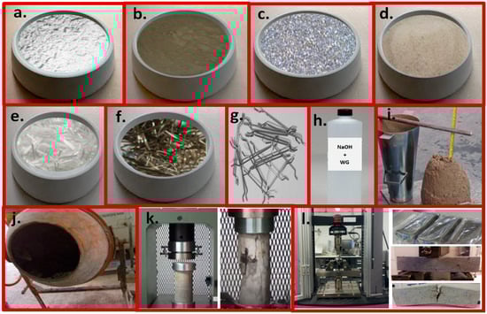 (a) Ground granulated blast-furnace slag, (b) fly ash, (c) gravel, (d) sand, (e) polypropylene fiber, (f) blast fibers, (g) hooked-end steel fibers, (h) alkaline activators solution, (i) slump test, (j) mixing machine, (k) compression test, and (l) 3-point bending test.