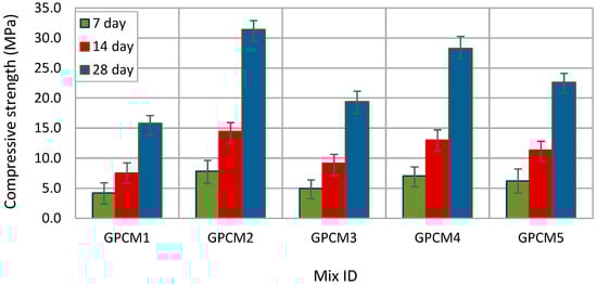 Figure 3 represents the effect of geopolymer-based materials on the GPC’s compressive strength results. It can be indicated that the compressive strength of GPC under ambient curing conditions is significantly influenced by the type and proportion of aluminosilicate binder materials. More specifically, geopolymer concrete specimens (GPCSs) produced with GPCM1 (100% FA) exhibited low 7-, 14-, and 28-day compressive strengths of 4.2, 7.5, and 15.8 MPa, respectively. The limited strength development can be attributed to the slow pozzolanic reaction at room temperature, which delays the development of calcium silicate hydrate (C–S–H) and this can lead to higher porosity due to unreacted FA particles which decreases GPC matrix density and strength [33]. GPCSs produced with GPCM2 (100% GGBS) presented higher compressive strength developments of 84%, 92%, and 99% at 7, 14, and 28 days, respectively, compared to those of GPCM1 at the same specified ages. The superior early age performance even under ambient conditions can be attributed to the high calcium oxide content of GGBS, which facilitates faster matrix formation. GPCSs made with blended GPCMs such as GPCM3 (75% FA and 25% GGBS) demonstrated higher compressive strength results of 18%, 20%, and 23% at 7, 14, and 28 days relative to GPCM3 (100% FA), and that indicates the beneficial influence of incorporating even small proportions of GGBSs into FA-based geopolymers. Moreover, GPCSs produced with the GPCM4 mix, which was composed of 75% GGBS and 25% FA, achieved considerably higher compressive strength results across all ages compared to those of blended mixes (GPCM3 and GPCM5). For instance, the compressive strength enhancements of GPCSs made with GPCM4 at 7, 14, and 28 days were 68%, 73%, and 79%, respectively, compared to those produced with GPCM1 and this enhancement can be attributed to the dominance of GGBS’s calcium-rich reactivity. GPCSs formed with GPCM5 (50:50 FA-GGBS) presented balanced behavior by showing satisfactory compressive strength gains of 6.2, 11.3, and 22.5 MPa at 7, 14, and 28 days, respectively, achieving approximately up to 37% compressive strength enhancement greater than that of GPCM1 (100% FA). From the above, it can be indicated that increasing the GGBS content consistently enhances the rate of compressive strength development under ambient curing. These observations align with previous conclusions which emphasize the role of GGBS in accelerating geopolymerization and improving mechanical performance in low-temperature environments [34,35].