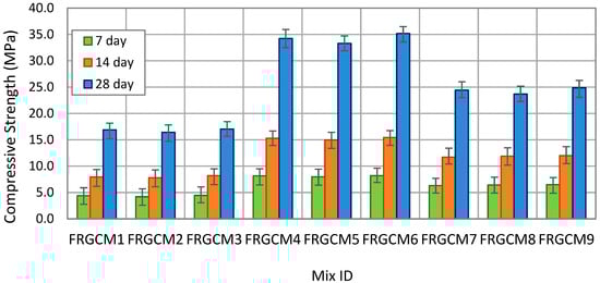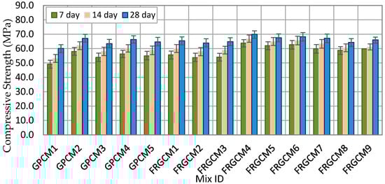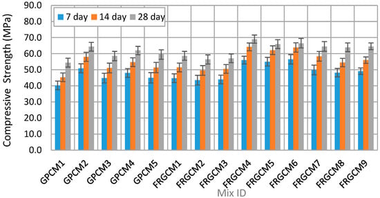 The compressive strength performance of geopolymer concrete (GPC) under ambient curing conditions is also influenced by the type and dosage of reinforcing fibers. Figure 4 shows the impact of incorporation of 0.75% hooked-end steel fibers (HESFs), 0.75% basalt fibers (BFs), and 0.5% polypropylene (PPF) on GPC compressive strength at 7, 14, and 28 days. More specifically, the addition of 0.75% HESF into the GPC mixture composed entirely of 100% FA (FRGCM1) resulted in a slight compressive strength development up to 7% at 28 days, compared to that without fibers (GPCM1). In the same way, BF did not contribute to strength development in 7 days and had a slight increase up to 4%. This slight improvement can belong to the role of HSF and BS in improving crack-bridging efficiency and enhanced internal stress distribution. Similarly, the addition of 0.5% PPFs resulted in compressive strength enhancement up to 8% after 28 days. Basically, the addition of PPFs aids in enhancing the residual strength and toughness of FA-based composites and that can improve unconfined compressive strength [36,37]. In the same way, the addition of 0.75% HESF, 0.75% BF, or 0.5% PPF into GPC mixes produced with 100% GGBS showed minor strength developments up to 9% (FRGCM4), 6% (FRGCM5), and 12% (FRGCM6), respectively, compared to those of GPCM2 at 28 days. Blended reinforced geopolymer mixes, containing 50% FA and 50% GGBS (FRGM7, FRGM8, and FRGM9) exhibited the same trend of FRGPC specimens produced with 100% FA and 100% GGBS. More specifically, the inclusion of HSF, BS, and PPF into blended mixes led to compressive strength enhancements up to 8%, 5%, and 10% at 28 days, respectively.