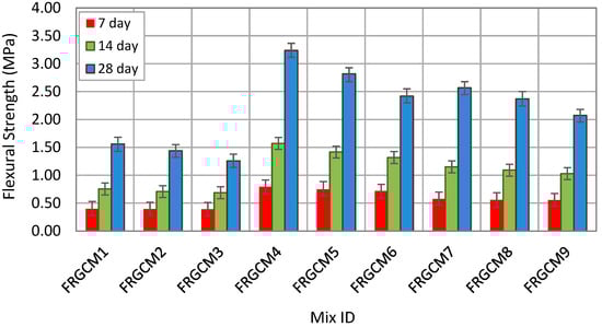 Figure 8 represents the effect of different fiber types, i.e., HESFs, BSFs, and PPFs, on flexural strength development. Based on Figure 8, it is obvious that the flexural strength of GPC is significantly sensitive to the type and proportion of both the binder materials, i.e., FA, GGBS, or their blends, and the reinforcing fibers. In 100% fly ash-based GPCS (GPCM1), flexural strength was generally limited at early ages due to the slow rate of polymerization under ambient curing conditions. However, the inclusion of 0.75% HESF resulted in a maximum flexural strength enhancement of approximately 35% (FRGCM1) at 28-days compared to that of GPCM1 (without fibers). This enhancement is primarily due to the effect of HESFs in bridging cracks, redistributing load, and improving post-cracking behavior. The addition of 0.75% BSFs also improved the flexural performance at 28 days up to 23% (FRGCM2) under ambient curing conditions, relative to that of GPCM1. The flexural strength growth achieved by BSFs can be attributed to the impact of the fiber in improving the bonding and bridging capabilities of a concrete matrix, though BSFs are slightly less effective than HESFs due to the differences in their physical and mechanical properties. The incorporation of 0.5% PPF into 100% fly ash-based GPCS resulted in more modest gains of 9% (FRGCM3) under ambient curing conditions, as their low modulus limits their ability to resist flexural stresses, though they still contribute to crack resistance and toughness. For 100% GGBS-based GPC specimens, the flexural strength growths were more pronounced at initial ages due to rapid reaction kinetics from the high calcium content. Furthermore, the addition of 0.75% HESF into 100% GGBS-based mixes led to significant flexural strength improvements of approximately 53% (FRGCM4) at 28 days, with noticeable improvements of 26%, and 15% at 14 and 7 days, respectively. On the other hand, the inclusion of 0.75% BSFs into 100% GGBS-based GPC showed a similar trend to that of HESFs but a slightly lower flexural strength development of 30%, 14%, and 8% (FRGCM5) at 28, 14, and 7 days, respectively, compared to those of GPCM2. The addition of PPFs resulted in the lowest flexural strength gains of 4%, 7%, and 11% relative to flexural strengths of GPCM2. On the other hand, fiber-reinforced blended mixes, i.e., FRGCM7, FRGCM8, and FRGCM9 offered balanced flexural strength performance. More specifically, the incorporation of 0.75% HESFs, 0.75% BSFs, and 0.5% PPFs into blended GP mixes, which included 50% GGBS and 50% FA, led to maximum 28-day flexural strength improvements of 34%, 20%, and 9% under ambient conditions, relative to flexural strength results of GPCM5. These findings align with most of the previous literature, which underlined the importance of imbedded fibers in improving bond strength and the flexural capacity of GPC composites, particularly in low-calcium systems like FA-based mixes where ductility and toughness are crucial [20,41,42,43].