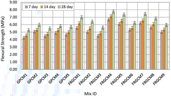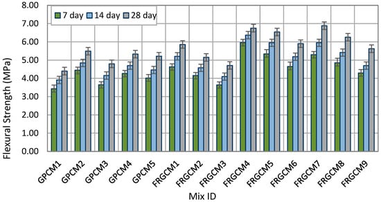 According to Figure 9, oven curing (60 °C for 24 h) had a significant impact on the development of flexural strength, particularly GPC specimens produced with 100% FFA. For instance, GPCSs produced with GPCM1 recorded significant early flexural strength enhancement up to eight times of its peers under ambient curing conditions. On the other hand, GPCSs made of GGBS-rich mixes showed more initial strength gains of 37% at 7 days under oven curing compared to GPCM1 (100% FFA), this additional strength growth was due to already accelerated early reactions and exhibited 552% compared to its peers under ambient conditions. Conversely, GPCSs formed with blended mixes, i.e., GPCM3, GPCM4, and GPCM5, demonstrated 7-day flexural improvements of around 700%, 590%, and 650%, respectively. The strength enhancement was highly dependent on the blending percentage of FA and GGBS, while the addition of fibers further enhanced flexural strength performance. For instance, FRGCM1 (100% FA and 0.75% HESF) resulted in a 7-day flexural strength improvement of up to 36% under oven curing conditions relative to that without fibers (GPCM1) under the same curing conditions. The strength’s growth can be attributed to the excellent crack-bridging and load-transfer capacity of HESFs. Also, FRGCM2 (100% FA and 0.75% BSFs) had a 7-day strength gain of 20% under ambient curing which was less than that of specimens which included 0.75% HESF by 6%. Furthermore, FRGCM3 (100% FA and 0.5% PPFs) recorded 10% flexural strength improvement at 28 days due to lower stiffness and bond strength. However, FRGCM4 delivered the highest flexural strength outcomes across all curing regimes, with high early age performance even under ambient curing, and the application of oven curing regime added additional strength to reach 6.75 MPa at 28 days. Blended GPCMs with fibers (FRGCM7, FRGCM8, and FRGCM9) showed balanced strength enhancements less than those of GGBS-based reinforced mixes and higher than FFA-based reinforced mixes (FRGCM1, FRGCM2, and FRGCM3) in all involved regimes, as shown in Figure 8, Figure 9 and Figure 10. Also, their flexural strength enhancements were highly influenced by the applied regime. More specifically, it was indicated that steam curing was more effective for all involved mixes, especially with FA-rich mixes. For instance, the flexural strength results of GPCSs produced with GPCM1 under ambient curing, oven curing, and steam curing were 0.38, 3.43, and 4.24 MPa, respectively. The same trend was obtained for the rest of the FFA-based reinforced mixes cured under the steam curing regime. Fiber-reinforced GGBS and blended fibered specimens under steam curing recorded less flexural strength improvements but their strengths were still higher than those of 100% FFA-based mixes in all curing ages, as shown in Figure 7, Figure 8, Figure 9 and Figure 10.