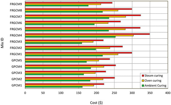 Total cost of for production GPC produced with different GPCMs under different curing regimes.