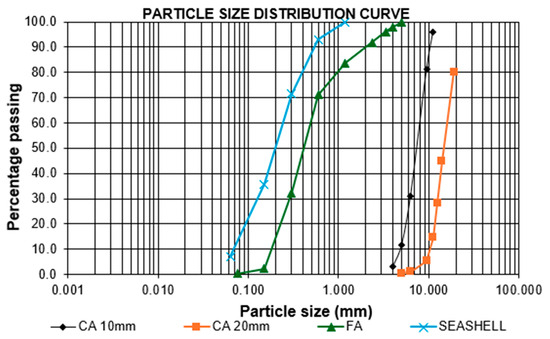 The particle size distribution (PSD) curve presented in Figure 1 illustrates the gradation characteristics of the selected materials: coarse aggregate (10 mm and 20 mm), fine aggregate (FA), and seashell powder. The curve indicates that the coarse aggregates (CA 10 mm and CA 20 mm) exhibit a relatively narrow size range with steep slopes, representing their well-defined gradation. The fine aggregate (FA) shows a broader distribution with finer particle sizes, ensuring good packing and filling of voids within the mix. The seashell powder, on the other hand, presents an even finer gradation, predominantly in the micro-size range, highlighting its potential role as a filler material [31]. The seashell powder filler range was 63–125 micron (as can be seen in the PSD curve), whilst particles smaller than 63 micron were used as a cement replacement to improve reactivity.