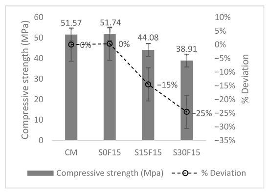 Compressive strength of concrete mixes and the percentage deviation from the Control mix.