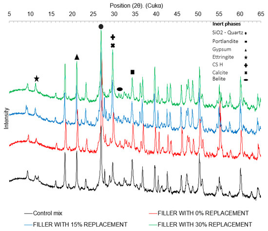 The quantitative Rietveld results shown in Table 4 reinforce these trends. Quartz remains the predominant phase in all samples, varying slightly from 60.6% in the control mix to 58.1% in the 30% replacement mixture. The content of portlandite decreases from 9.8% in the control mix to 5.4% at 30% replacement, reflecting reduced hydration or dilution effects. In contrast, calcite shows a substantial increase from 5.8% to 25%, confirming the contribution of carbonate material from the filler. Minor variations are observed in the quantities of ettringite (5–10%) and gypsum (3–8%), while the relative content of C–S–H remains low (1–3%), which is typical given its poorly crystalline nature and the limited detection sensitivity of XRD. Belite is present in trace amounts (<1%) in all mixtures.
