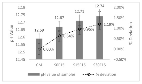 The chemical environment within concrete is strongly influenced by its pH level, which plays a critical role in determining durability and resistance to reinforcement corrosion. Freshly prepared concrete typically maintains a highly alkaline environment with a pH between 12 and 13, providing a protective passive layer around reinforcing steel. A reduction in alkalinity can destabilise this passive film, increase the risk of steel corrosion and compromise structural durability. Therefore, monitoring pH levels is essential for assessing the long-term performance of concrete. From the experimental results, the control mix (CM) exhibited a pH of 12.59, which falls within the expected range for normal concrete. When scallop seashell powder and fillers were incorporated, a gradual increase in alkalinity was observed, as shown in Figure 8. The S0F15 mix reached a pH of 12.67 (0.64% increase relative to CM), the S15F15 mix attained 12.71 (0.95% increase), and the maximum pH of 12.74 (1.19% increase) was observed for the S30F15 mix.