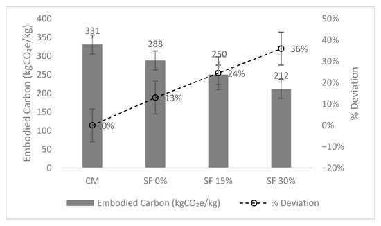 Carbon Emission from different concrete mixes and the percentage deviation from the Control mix.
