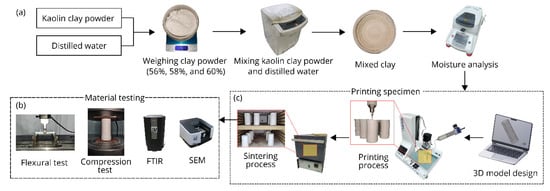 Schematic overview. (a) Specimen mixing and moisture check, (b) specimen testing and analyzing, (c) specimen fabrication and sintering.
