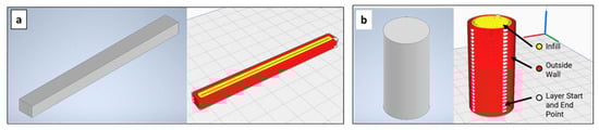 Three-dimensional and sliced models: (a) flexural; (b) compression specimen.