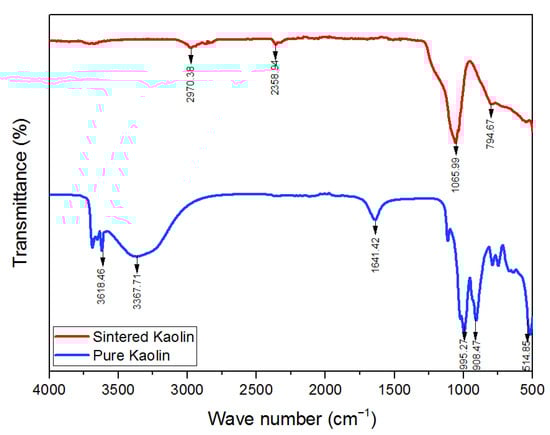 FTIR analysis of pure and sintered kaolin demonstrates notable structural transformations induced by sintering. In pure kaolin, distinct hydroxyl (–OH) stretching vibrations are observed at 3618.46 cm−1 and 3367.71 cm−1, characteristic of kaolinite, while the band at 1641.42 cm−1 corresponds to adsorbed water. Following sintering, these hydroxyl peaks disappear, indicating dihydroxylation and the conversion of kaolinite into metakaolin. Concurrently, the emergence of new peaks at 2970.38 cm−1 and 2358.94 cm−1 may reflect interactions with atmospheric gases or carbonization. Shifts in Si–O and Al–O vibrations at 1065.99 cm−1 and 794.67 cm−1 further suggest structural rearrangements, potentially associated with forming amorphous aluminosilicates or mullite at elevated temperatures [52].