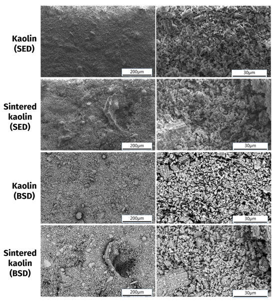 Comparative analysis of pure and sintered kaolin (Figure 4) highlights notable structural transformations induced by the sintering process. In its raw state, kaolin particles appear highly irregular, loosely packed, and marked by broad size distribution, surface roughness, and microporosity. Following sintering, the microstructure becomes more consolidated, with particle fusion producing a denser matrix while retaining some surface roughness [18]. Grain growth contributes to a more uniform particle distribution; residual layered structures and cracks indicate incomplete sintering [54]. These morphological changes reflect enhanced particle bonding and improved mechanical strength, underscoring the role of sintering in optimizing kaolin’s structural performance.