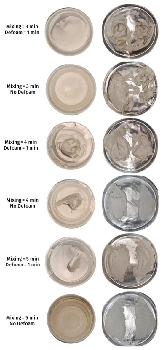 Six different clay–water mixtures were prepared and evaluated to determine the optimal mixing configuration. For each trial, 116 g of cosmetic-grade kaolin clay was combined with 84 g of distilled water, and the mixture was placed in a container with a 90 mm diameter. The variations in mixing conditions and their corresponding results are presented in Figure 5, offering a comparative overview of mixture performance.