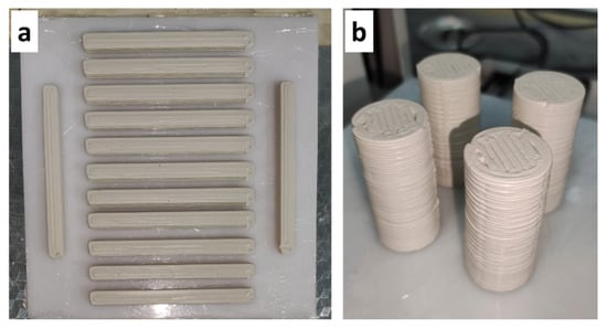 Three-dimensional clay printing specimens: (a) flexural; (b) compression testing.
