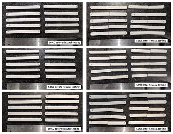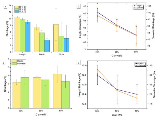 It is essential to make precise design adjustments to ensure that the final printed specimens or products meet the required dimensions after processing. For example, in the case of flexural test specimens, the 3D CAD model must be designed 10 mm longer than the intended final length. This adjustment compensates for dimensional shrinkage during drying and sintering, ensuring the final product conforms to the specified size requirements [28,60]. The detailed shrinkage behavior of all specimens is presented in Figure 7a,b.