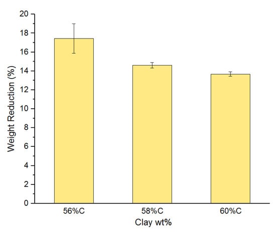 As shown in Figure 7d, most moisture is eliminated during the air-drying stage, as indicated by the significant shrinkage observed in this phase. Specimens with higher initial water content exhibit greater volumetric shrinkage, as illustrated in Figure 7a,c. Similarly, Figure 8 demonstrates that these moisture-rich specimens also undergo the largest weight reduction. This behavior occurs because specimens with elevated water content inherently contain more bound and free water, which is progressively expelled during drying and sintering, leading to a more pronounced reduction in volume and weight.