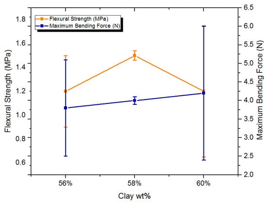 In 3D printing clay, a higher clay concentration (with less water) results in greater flexural strength due to several factors [44,63]. Increased clay content enhances particle cohesion and bonding, creating a denser, more interconnected structure that resists bending forces [23]. Less water reduces deformation during printing and shrinkage during drying [37,39]. The lamellar structure of clay particles interlocks more effectively, further improving structural integrity. Additionally, if the printed object undergoes sintering, a higher clay concentration facilitates the formation of a denser and stronger ceramic phase, significantly increasing flexural strength [64]. However, while a higher clay ratio improves strength, adequate water content is still necessary to ensure smooth extrusion and prevent nozzle clogging during printing.