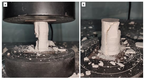 Noticeable slumping occurs when printing compression specimens using the 56% clay mixture. This issue originates from the movement of the printing bed along the y-axis, which displaces the clay and results in a skewed alignment in the upper portion of the specimen body, as illustrated in Figure 16c. To minimize this problem, it is advisable to reconsider the slicing strategy and reduce bed movement along the y-axis as much as possible. Interestingly, this phenomenon is less pronounced in specimens with higher clay content [6]. Mixtures with a greater proportion of clay contain a higher volume of solid particles, which enhances both shear and storage moduli. An increased storage modulus substantially improves the specimen’s resistance to external forces such as gravity and shear, producing a more stable and structurally sound product [23,69].
