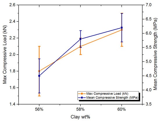 The failure modes and fractured specimens are presented in Figure 11a,b, while Figure 12 illustrates the compressive strength of the sintered samples. The results indicate that specimens with higher clay content exhibit greater compressive strength. Among the tested samples, the 60% clay specimen achieved the highest value at 6.14 MPa, whereas the 56% clay specimen recorded the lowest strength at 4.546 MPa. This difference demonstrates that the 60% clay specimen is approximately 35% stronger than the 56% clay specimen, despite the relatively small variation of only 4% in clay content. The enhanced compressive strength at higher clay concentrations can be attributed to several factors. A greater clay fraction produces a denser microstructure with fewer pores, thereby minimizing potential weak points. Reduced water content further decreases shrinkage and the formation of microcracks [65], resulting in a more compact and uniform material. Moreover, the strong cohesive and binding characteristics of clay particles enhance structural integrity [17,36,66], improving resistance to compressive forces. The lamellar morphology of clay particles also promotes interlocking, which reinforces the overall structure against compression.