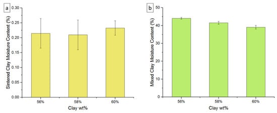 Moisture is crucial in determining the strength of 3D-printed clay throughout its printing, drying, and sintering stages [26,50,54]. Proper humidity is vital for successful printing. Too much water makes the material too soft and causes deformation. Too little can lead to nozzle clogs and uneven prints. During drying, moisture levels affect shrinkage [35], and cracking excess water leads to more significant shrinkage and a higher risk of cracks [47], weakening the material. Before sintering, optimal moisture content ensures a denser, more compact final structure, as residual moisture can create internal pores that reduce compressive and flexural strength [67]. Proper moisture control at each stage is key to achieving a stable, durable, high-strength 3D-printed clay structure. The detailed moisture analysis of both the sintered and mixed clay samples is depicted in Figure 13a,b, providing valuable insight into their respective moisture characteristics.