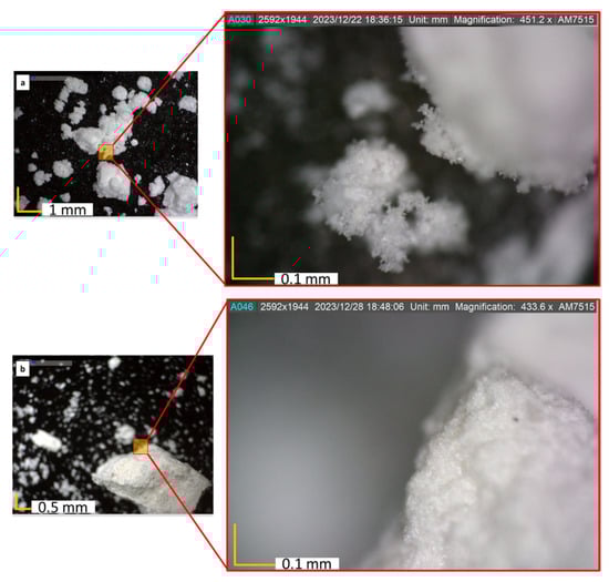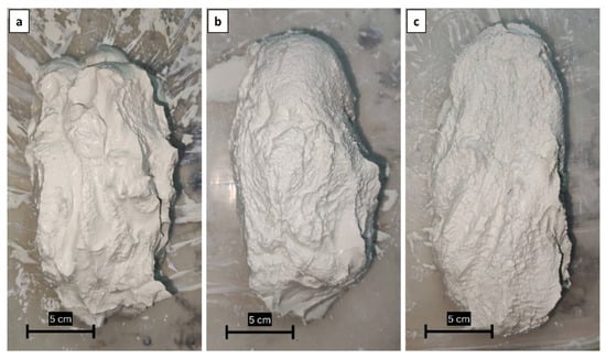 In contrast, the 56%C mixture is very wet and sticky during mixing. It does not hold its shape and is difficult to load into the barrel. Figure 14a–c presents a detailed representation of the hand-formed shape of the mixtures before their insertion into the barrel. The outcomes of the visual examination in different magnifications are illustrated in detail in Figure 15a,b, providing a comprehensive overview of the observed results.