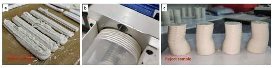 If the pressure ratio is too low, the piston does not supply enough material during extrusion, causing gaps in the feeding tube [43,68]. Conversely, an excessively high ratio forces too much clay into the system, particularly problematic for mixtures with higher water content. This can lead to excess material and moisture exiting the nozzle [39], producing overly wet and inconsistent prints [26]. Additionally, clay with elevated water content exhibits higher viscosity, which can obstruct smooth movement through the screw extruder. Under such conditions, the piston may push excessive material into the system, resulting in jamming. This overload increases the risk of motor gear slippage, potentially damaging the extruder motor and barrel, leading to costly repairs and downtime. The effects of incorrect pressure ratios during printing are shown in Figure 16.