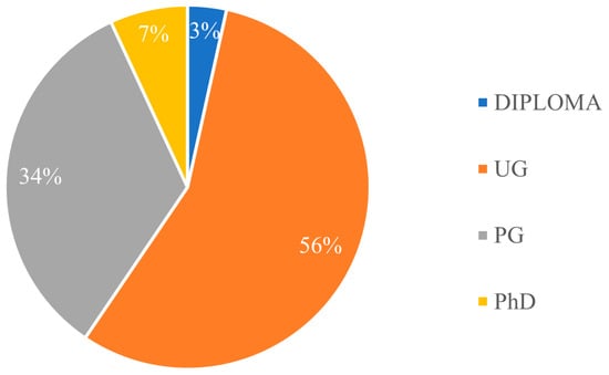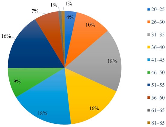 The age distribution of respondents shows a well-represented and diverse sample, spanning across various stages of professional life (Figure 2). The largest segments of respondents fall in the 31–35 and 41–45 age groups, each accounting for 18.1%, indicating a strong representation from mid-career professionals. Following these, the 36–40 and 51–55 age groups each account for 16.4% of the sample, indicating substantial representation of mid- to late-career professionals who are likely to occupy managerial or policy-influencing positions. The 26–30 age group makes up 10.3%, reflecting early-career professionals’ engagement in the field. Smaller but meaningful contributions come from the 46–50 (8.6%) and 56–60 (6.9%) age groups. Young professionals (20–25) and senior respondents (61–65 and 81–85) are less represented, each group contributing less than 4% individually. Overall, the data reflects a balanced and mature respondent base, predominantly composed of individuals in the 31 to 55 years age range—key demographics likely involved in planning, execution, and decision-making processes in the construction and waste management sectors.