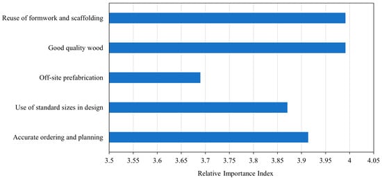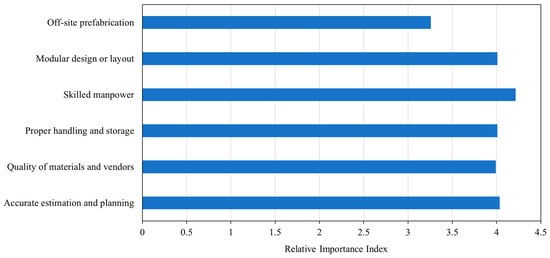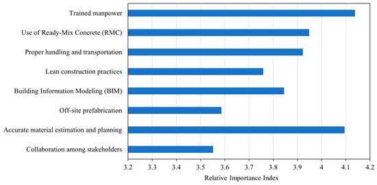 b. The Relative Importance Index (RII) was applied to evaluate and rank the effectiveness of various waste minimization strategies. Higher RII values reflect a stronger consensus among industry professionals regarding the usefulness of a particular mitigation measure.