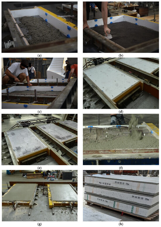 Production process of the textile-reinforced concrete (TRC) sandwich panel: (a) casting the first concrete layer (15 mm); (b) placing the carbon textile reinforcement and pressing it into the fresh concrete to the target depth/position; (c) casting and troweling the second concrete layer (15 mm); (d) placing the EPS insulation layer and inserting the connector pins through the EPS; (e) placing the carbon textile reinforcement for the second layer, including additional reinforcement over the anchor zones; (f) casting the concrete for the second layer; (g) finishing the casting by troweling the top surface; (h) completed specimens.