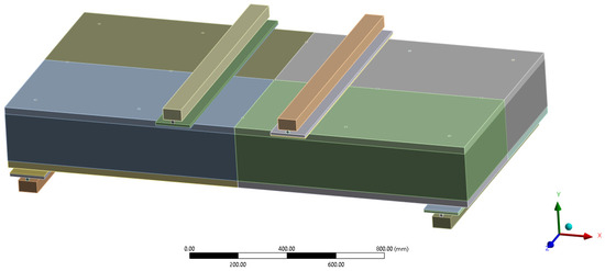 The geometry of the model replicated experimental specimens, including the panel dimensions (2000 mm × 1000 mm), TRC shell thickness (30 mm each), insulation core (EPS, 210 mm), and connector arrangement (GFRP rods with 12 mm diameter arranged on a 450 mm × 400 mm grid in span and transverse directions, respectively). Also, the model includes equivalent components for the supporting and loading system to match with experimental setup. This system includes two symmetric point loads and two pin supports. Figure 4 shows this model.