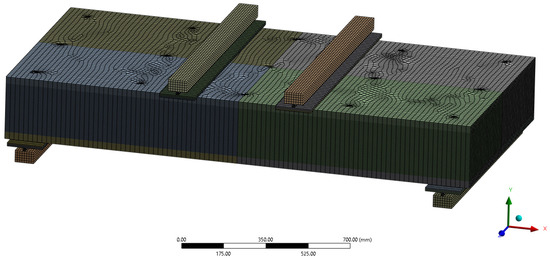 The mesh was generated primarily with linear hexahedral elements (≈99%), complemented by wedge elements where required. Mesh refinement was applied near the connectors to capture stress concentrations (Figure 5). Load steps were applied incrementally to monitor deflection and internal forces under increasing load levels. The results of the simulation are discussed in Section 3.4. The result includes the evaluation in the same position measured with LVDT.