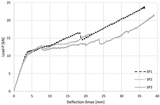 Load–deflection curves of the three TRC sandwich panel specimens SP1, SP2, and SP3.