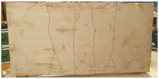 In the nonlinear region, minor slope changes appeared in the load–deflection curve. These irregularities were not caused by connector failure but were associated with the formation of additional flexural cracks and the resulting localized redistribution of internal forces in the TRC layers, particularly beneath the load introduction points and in the regions around the GFRP connectors. The corresponding crack pattern is illustrated in Figure 7.