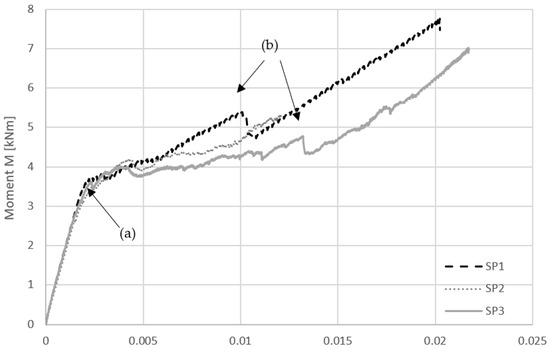 Beyond the linear-elastic range, the moment–normalized deflection curve continues to rise, although at a decreasing slope ((a) in Figure 8). No abrupt drop in moment or signs of brittle failure were observed. Instead, the transition into the nonlinear range is smooth and gradual, suggesting a progressive formation of cracks in the TRC layers and an increasing contribution of the textile reinforcement to the load-bearing behavior. Small fluctuations in the moment curve were also observed, which can be attributed to the initiation and propagation of cracks ((b) in Figure 8). These observations are highlighted in Figure 8, where the transition points are marked, and they are consistent with the crack patterns shown in Figure 7.