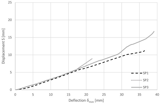 For each of the three nominally identical specimens (SP1–SP3), the slip shown in Figure 9 was calculated as the average of the readings from S1 and S2 and plotted against the corresponding mid-span deflection. The resulting slip–deflection curves are almost linear up to a vertical deflection of approximately 17 mm. Beyond this point, the curve remains nearly linear, with only a slight deviation from the initial slope. This behavior is illustrated in Figure 9, which shows the measured slip–deflection curves. This subtle change in curvature is likely caused by the initiation and propagation of cracks in the tensile TRC layer, which slightly alters the stiffness distribution without indicating a failure of the connectors.
