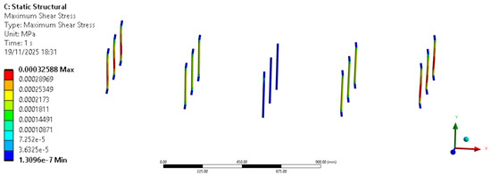 Although no damage or cracking was modeled, the simulation provided insights into the load paths and stress redistribution within the composite system. The connectors effectively coupled the TRC shells during early loading, but the simulation confirmed that they were subjected to bending and shear deformation even within the linear regime. Figure 10 shows how the connectors are supporting compression stresses and Figure 11 shows that connectors outside of the symmetry plane supports relevant shear stresses.