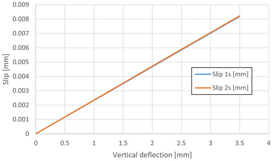 Slip–deflection relationship measured from LVDTs 1s and 2s.