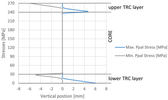 Stresses distribution over the panel determines that the two TRC layers behave as two independent layers in terms of stresses levels because the maximum tensile and compression stresses at each layer have similar magnitude, see Figure 13. This effect demonstrates that the TRC layers are connected but not fully coupled. It could be mitigated using a core layer with elastic modulus closer to the one of the TRC layers.