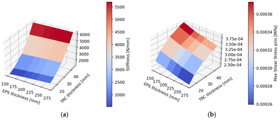 The numerical model provides a valuable tool for optimizing geometrical parameters—such as the number and orientation of connectors, and the thickness of layers—prior to the design phase. It enables the prediction of the elastic response of the system and the identification of critical zones that may require reinforcement in future designs. Thanks to its reduced evaluation time, the model can be used to explore a wide range of parameter combinations efficiently. Based on this capability, an optimization tool has been developed considering the following variables: number of connectors, connector angle, and layer thickness. Figure 14 presents some results of this optimization, showing the influence of layer thickness on two key outcomes: stiffness and maximum shear stresses in the connectors. The results indicate that TRC thickness has a stronger impact on both variables, while EPS thickness has a more moderate effect—its increase leads to higher stiffness but lower shear stresses in the connectors.