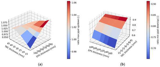 The parametric study on layer thicknesses further illustrates how the global panel response and the utilization of the connectors depend on the chosen geometry. Figure 14 shows that increasing the thickness of the TRC shells leads to a pronounced increase in global stiffness, but also to higher shear demands in the connectors, whereas a thicker EPS core has a more moderate effect on stiffness and tends to reduce connector shear stresses. Figure 15 summarizes the corresponding stress state in the faces by plotting the ratio between the principal stresses in the upper and lower TRC shells. The ratio of maximum principal stresses remains close to unity for all investigated configurations, which confirms that both faces are highly utilized in tension and contribute significantly to the flexural resistance. The ratio of minimum principal stresses exhibits a somewhat stronger dependence on shell thickness, particularly for the upper shell in the compression zone below the loading points. Overall, these trends emphasize that both TRC layers must be designed as active load-carrying faces and that appropriate combinations of shell and core thickness can be used to balance global stiffness, connector demand and face utilization for TRC–GFRP sandwich panels.