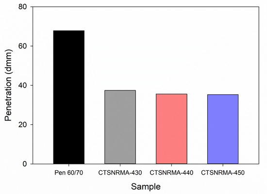 The incorporation of asphalt as a plasticizer in TSNR not only softens the natural rubber but also alters the conventional consistency properties of the resulting CTSNR-modified asphalt (CTSNRMA). As shown in Figure 2, increasing the asphalt content as a plasticizer decreases the penetration of CTSNRMA from 60/70 pen asphalt (67.8 dmm) to 35.3–37.4 dmm in the samples CTSNRMA-430, CTSNRMA-440, and CTSNRMA-450. This reduction in penetration suggests a corresponding increase in asphalt hardness, although the change is not substantial. A higher asphalt content, acting as a plasticizer in TSNR, results in smaller TSNR particle sizes with lower molecular weights, enhances the distribution of TSNR within the asphalt, and accelerates swelling. This swelling process facilitates the absorption of asphalt maltene, significantly increasing the volume of the rubber-rich phase fraction and forming a stiffer interpenetration network, which correlates with an increase in the modulus and stiffness of asphalt as a binder [29,49]. Consequently, the proportion of heavy fractions (asphaltene) and the viscosity of the asphalt both increase [29,30].