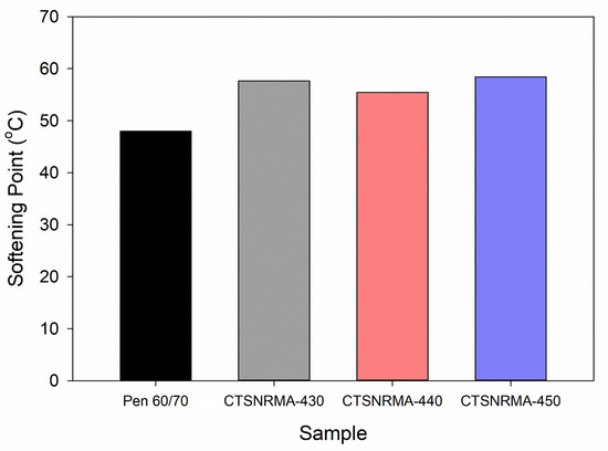 The same trend is also evident in the increase in TSNR levels with the addition of 50% plasticizer (CTSNRMA-450, CTSNRMA-650, CTSNRMA-850, and CTSNRMA-1050), as shown in Figure 5. The softening point of CTSNR-modified asphalt (CTSNRMA) was observed to increase from 58.4 °C to 63.1 °C. The softening point increased with increasing CTSNR content, leading to greater absorption of maltene fractions and significantly increasing the amount of asphaltene [60,61]. The high softening point of CTSNR-modified asphalt (CTSNRMA) is an essential indicator that the asphalt can maintain its stiffness and stability even at high operating temperatures. The primary advantage is improved pavement performance, particularly in preventing permanent deformation, such as rutting, caused by heavy traffic loads, especially in hot climates. Asphalt with a high softening point keeps the pavement firm and resistant to softening, which in turn extends the road’s lifespan, reduces maintenance costs, and enhances safety and comfort for road users [62,63,64]. Therefore, successful modification to increase the softening point yields stronger, more durable road pavement.