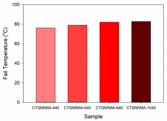 This critical capability is quantified using the rutting parameter (G*/sin δ), which assesses the viscoelastic response of asphalt as a binder to shear stress. Based on the analysis of experimental data presented in Figure 8, the modified asphalt formulations showed significant performance improvements. Samples CTSNRMA-440 and CTSNRMA-640 were identified as having a maximum failure temperature of 79 °C. Meanwhile, formulations with higher modification levels, namely CTSNRMA-840 and CTSNRMA-1040, showed superior thermal resistance, reaching a maximum failure temperature of 82.7 °C. This high failure-temperature classification indicates that TSNR modification with asphalt plasticizers effectively increases the operational temperature range of asphalt as a binder. Rheologically, this shows that the modified asphalt has a better ability to mitigate permanent deformation, such as rutting, under heavy traffic loads in hot climate conditions [79], compared to conventional asphalt. This increase in failure temperature values is directly correlated with the formation of a stronger polymer network in the asphalt matrix, which contributes to increased stiffness (G*) and elasticity of the material at extreme temperatures [79,80,81].