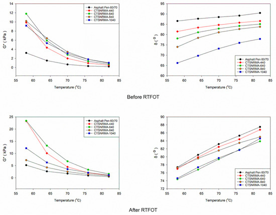 Based on the empirical data analysis presented in Figure 9, a significant performance improvement is observed in Compounded Technical Specification Natural Rubber (CTSNRMA) modified asphalt compared to conventional 60/70 penetration asphalt. Consistently, the complex shear modulus (G*) values of all CTSNRMA samples were recorded as higher than those of the control asphalt across the entire test temperature range. This phenomenon indicates that the CTSNR dispersion effectively increases the stiffness and load-bearing capacity of the asphalt matrix. However, the thermoplastic behavior of the material is still evident, as the G* value decreases with increasing test temperature. This decrease reflects the weakening of intermolecular forces at high temperatures, which causes a reduction in the material’s resistance to deformation [79,82]. However, this degree of stiffness reduction can be mitigated by adjusting the polymer composition. Observations on samples with higher polymer content, namely CTSNRMA-840 and CTSNRMA-1040, showed superior G* values at high temperatures compared to those of CTSNRMA-440 and CTSNRMA-640. This confirms that increasing the concentration of CTSNR substantially reduces the thermal sensitivity (temperature susceptibility) of the modified asphalt, making it more stable and resistant to high temperature changes [78].
