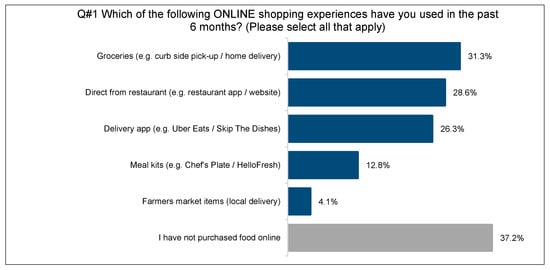 The first survey question asked, ‘Which of the following ONLINE shopping experiences have you used in the past 6 months? (Please select all that apply)’. The most popular choice was ‘I have not purchased food online’ at 37.2%, with the following in order of popular response: ‘Groceries (e.g., curb side pick-up/home delivery)’ at 31.3%, ‘Direct from restaurant (e.g., restaurant app/website)’ at 28.6%, ‘Delivery app (e.g., Uber Eats/Skip the Dishes)’ at 26.3%, ‘Meal Kits (e.g., Chef’s Plate/HelloFresh) at 12.8%, and ‘Farmers market items (local delivery) at 4.1%. From an age group perspective, 52.8% of the ‘Greatest Generation’, 57.1% of ‘Boomers’, and 39.9% of ‘Generation X’ responded with ‘I have not purchased food online’. A total of 35.3% of ‘Generation Y’ responded with ‘Groceries’, while 35.8% of ‘Generation Z’ responded with ‘Delivery app’ (See Figure 1).