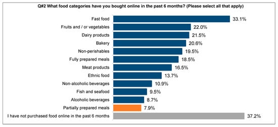 The second survey question asked, ‘What food categories have you bought online in the past 6 months? (Please select all that apply) (see Figure 2)’. The most popular choice was ‘I have not purchased food online in the past 6 months’ at 37.2%, with the following in order of popular response: ‘Fast food’ at 33.1%, ‘Fruits and/or vegetables’ at 22.0%, ‘Dairy products’ at 21.5%, ‘Bakery’ at 20.6%, ‘Non-perishables’ at 19.5%, ‘Fully prepared meals’ at 18.5%, ‘Meat products’ at 16.5%, ‘Ethnic food’ at 13.7%, ‘Non-alcoholic beverages’ at 10.9%, ‘Fish and seafood’ at 9.5%, ‘Alcoholic beverages’ at 8.7%, ‘Partially prepared meals’ at 7.9%. From an age group perspective, 52.8% of the ‘Greatest Generation’, 57.1% of ‘Boomers’, and 39.9% of ‘Generation X’ responded with ‘I have not purchased food online in the past 6 months’. A total of 39.7% of ‘Generation Y’, and 35.3% of ‘Generation Z’ responded with ‘Fast food’.