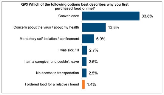 The third survey question asked, ‘Which of the following options best describes why you first purchased food online?’ (see Figure 3). The most popular choice was ‘Convenience’ at 33.8%, with the following in order of popular response: ‘Concern about the virus/about my health’ at 13.8%, ‘Mandatory self-isolation/confinement’ at 6.9%, ‘I was sick/ill’ at 2.7%, ‘I am a caregiver and couldn’t leave’ at 2.5%, ‘No access to transportation’ at 2.5%, and ‘I ordered food for a relative/friend’ at 1.4%. From an age group perspective, all groups responded that ‘convenience’ was the best description as to why they first purchased food online, with 22.2% from the ‘Greatest Generation’, 19.4% from ‘Boomers’, 31.9% from ‘Generation X’, 40.4% from ‘Generation Y’, and 35.3% from ‘Generation Z’.