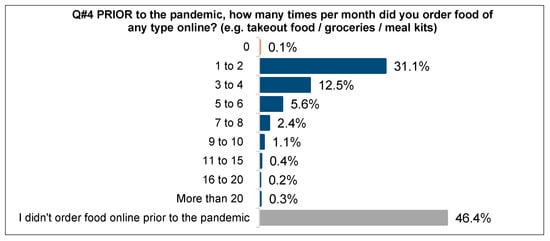 The fourth survey question asked, ‘PRIOR to the pandemic, how many times per month did you order food of any type online? (see Figure 4) (e.g., takeout food/groceries/meal kits)’. The most popular choice was ‘I didn’t order food online prior to the pandemic’ at 46.4% with the following in order of popular responses: ‘1 to 2’ at 31.1%, ‘3 to 4’ at 12.5%, ‘5 to 6’ at 5.6%, ‘7 to 8’ at 2.4%, ‘9 to 10’ at 1.1%, ‘11 to 15’ at 0.4%, and ‘More than 20’ at 0.3%. From an age group perspective, the most popular response with all age categories was ‘I didn’t order food online prior to the pandemic’. There was some variation in the age-related degree of response, with 66.7% of the ‘Greatest Generation, 67.9% of ‘Boomers’, 50.0% of ‘Generation X’, 36.9% of ‘Generation Y’, and 36.1% of ‘Generation Z’ answering this response.